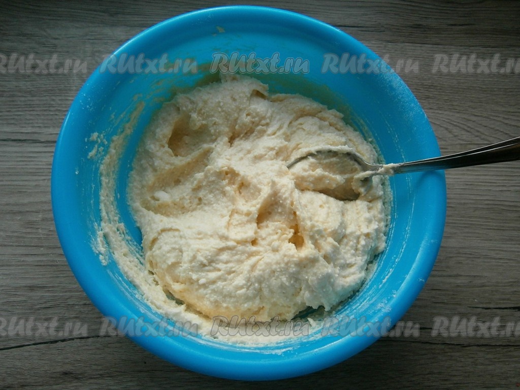 Масло сливочное растопить, немного остудить и вылить его в творожную массу, хорошенько перемешать венчиком.