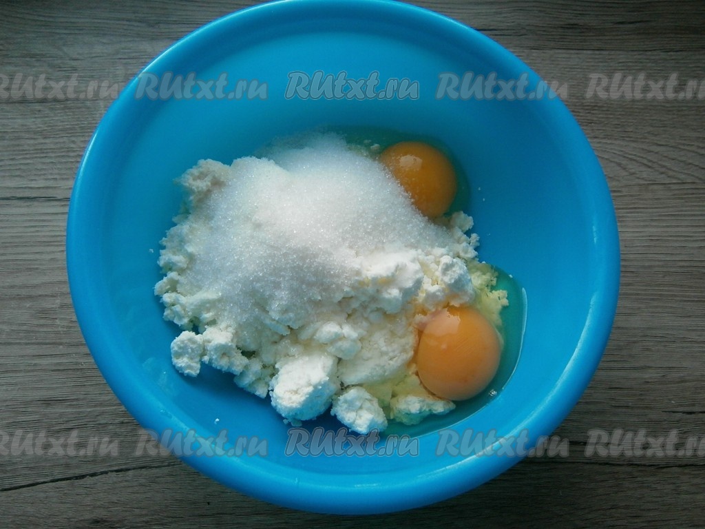 К творогу добавить яйца, всыпать сахар, ванильный сахар, щепотку соли.