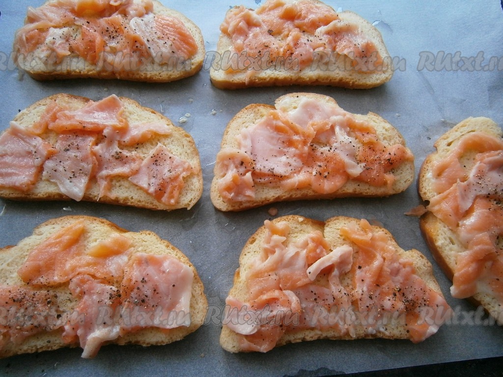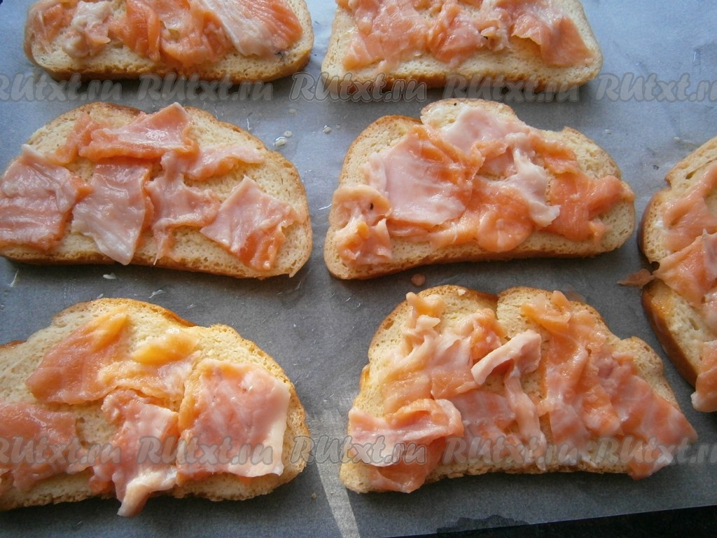 Застелить противень пергаментом, смазать его растительным маслом. Выложить на противень все ломти батона так, чтобы сторона хлеба, смоченная в молочно-яичной смеси, была сверху. На ломти выложить тоненькие кусочки рыбы.