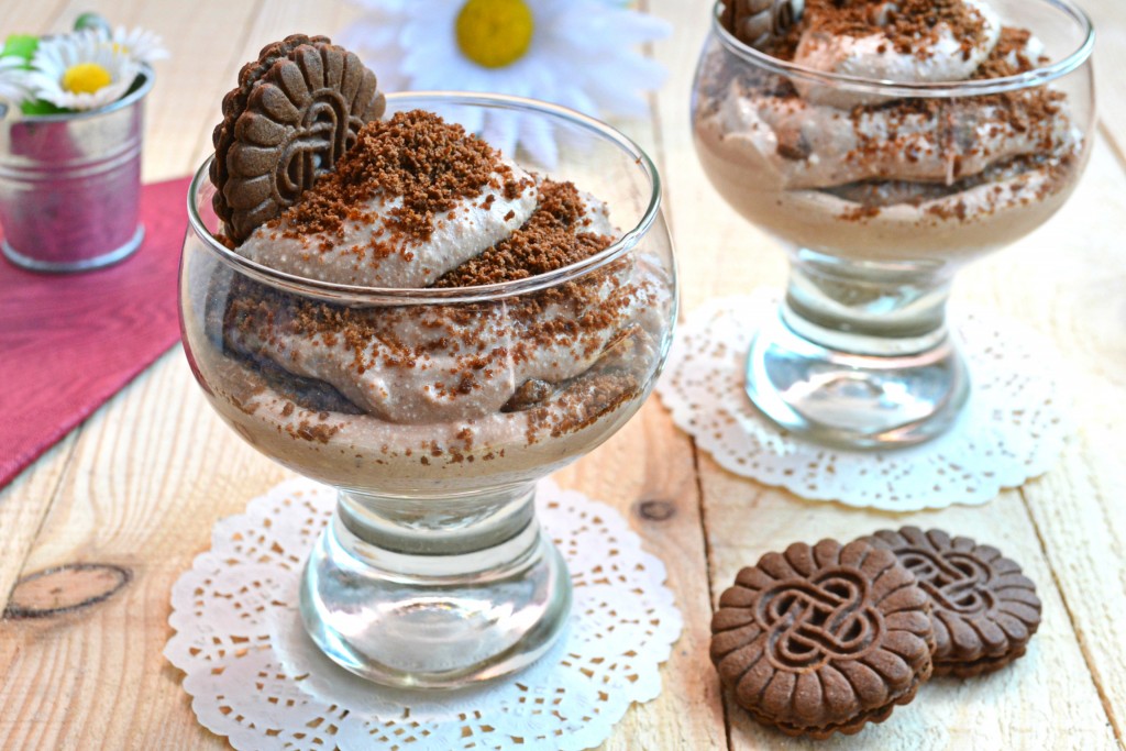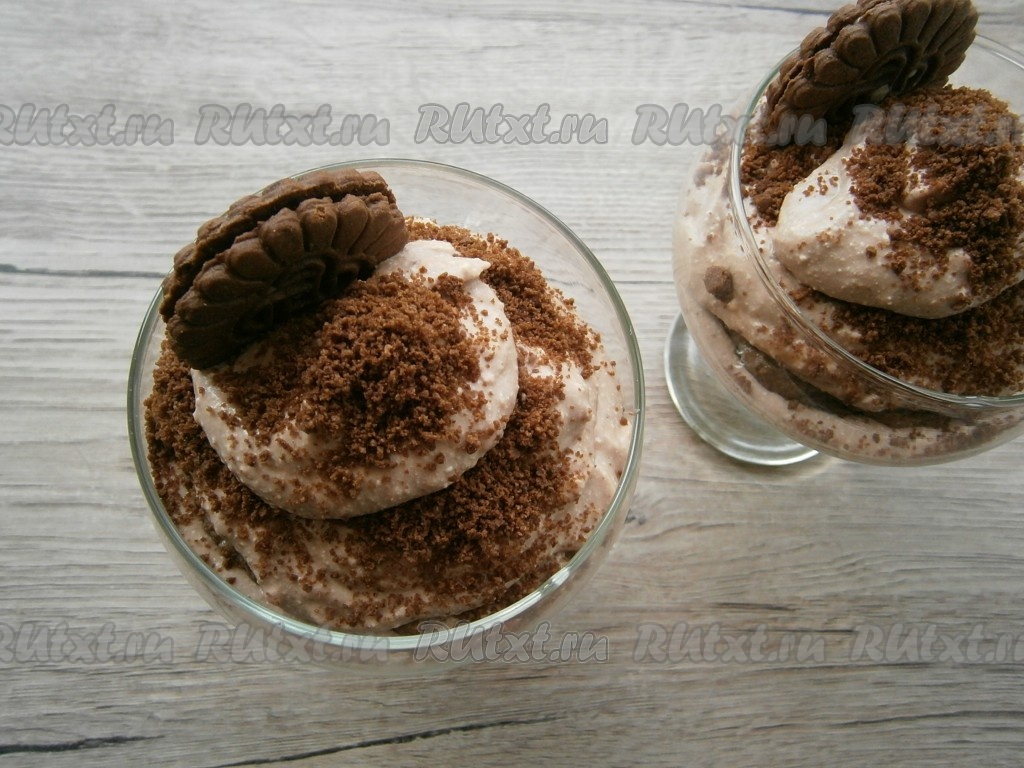 Сверху творожный десерт украсить крошкой из печенья и целым печеньем.