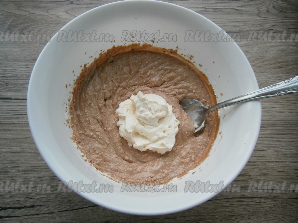 Далее в творожно-шоколадную массу добавить половину взбитых сливок, смешать миксером.