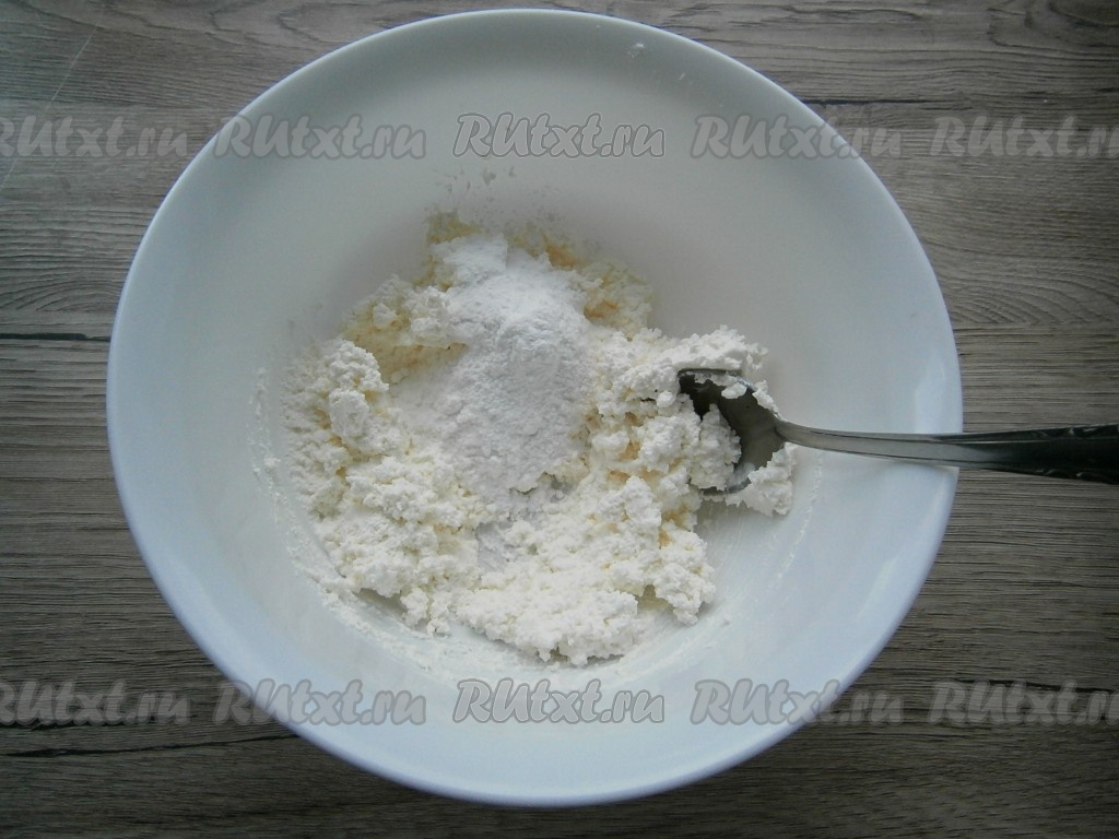В мягкий творог всыпать сахарную пудру.