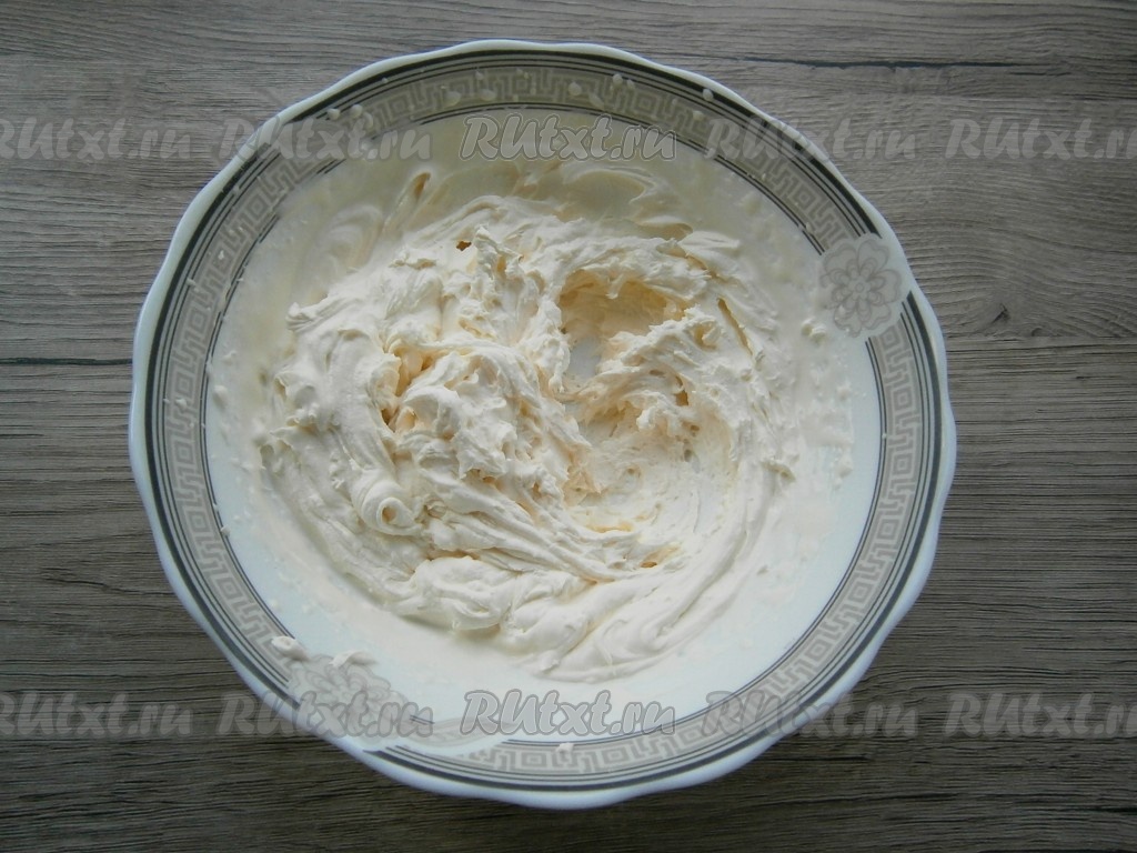 Охлажденные сливки взбить до мягких, но устойчивых пиков (не перебейте, иначе получится масло).