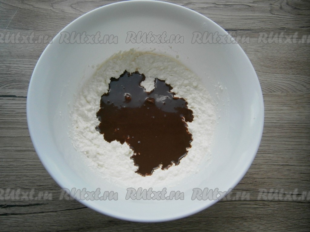 Взбить творог с сахарной пудрой миксером, после чего добавить остывший расплавленный шоколад, снова взбить.