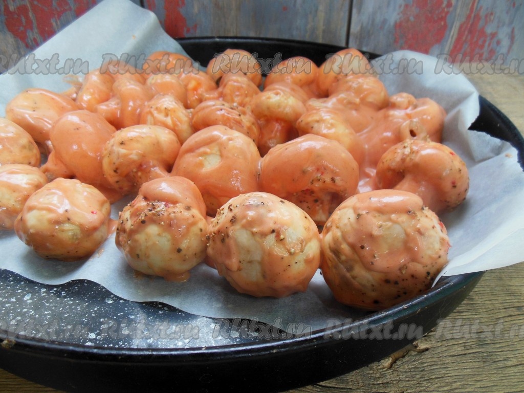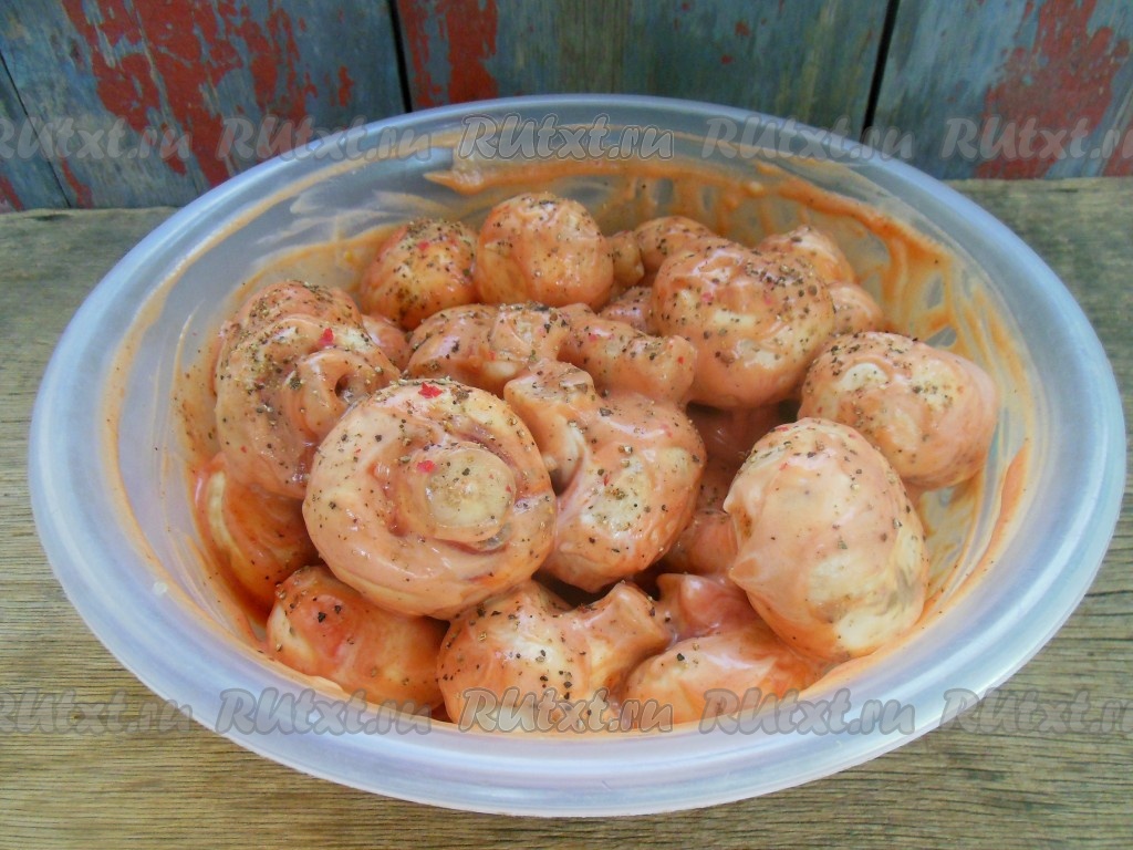 Запекайте шампиньоны в разогретой духовке при температуре 180-190 градусов 35-40 минут. В процессе запекания образуется небольшое количество жидкости, которая станет густым соусом. Шампиньоны, замаринованные в майонезе и томатном соусе по этому рецепту, можно запечь и на мангале на шампурах или на решётке в течение 15-20 минут (продолжительность запекания зависит от жара углей и того, насколько зажаристые грибочки вы хотите получить).