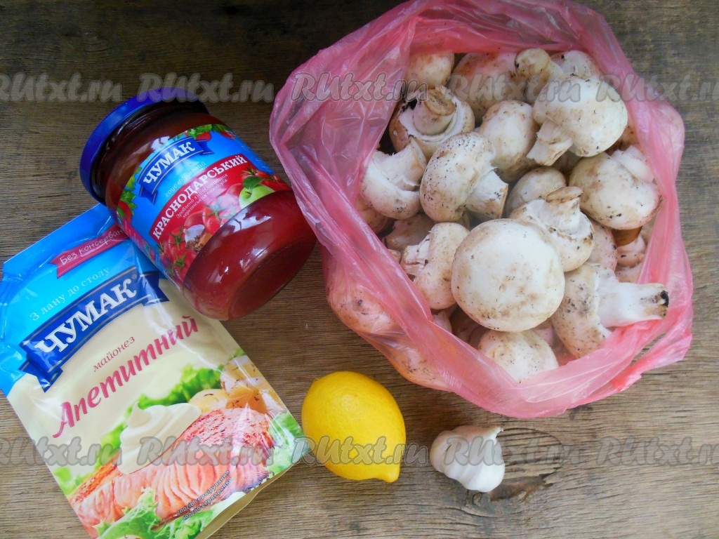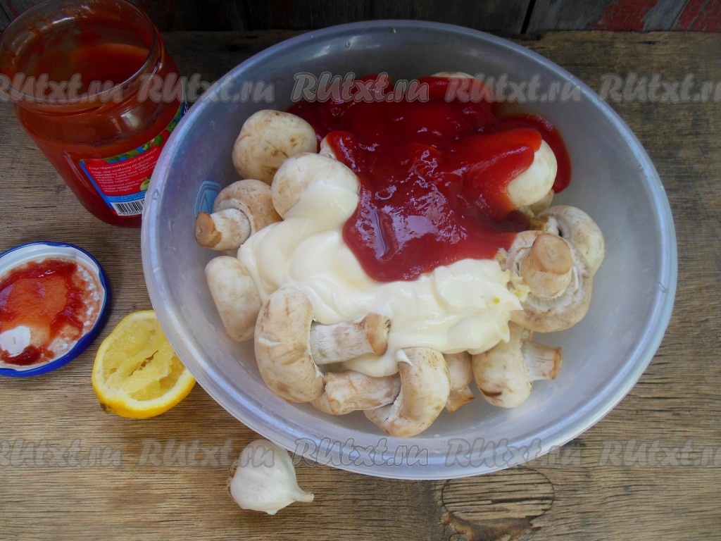 Шампиньоны тщательно вымойте, дайте стечь воде. Переложите грибы в глубокую миску, добавьте мелко нарезанный чеснок, черный молотый перец и соль по вкусу, майонез и томатный соус, полейте соком, выжатым из лимона, аккуратно перемешайте.