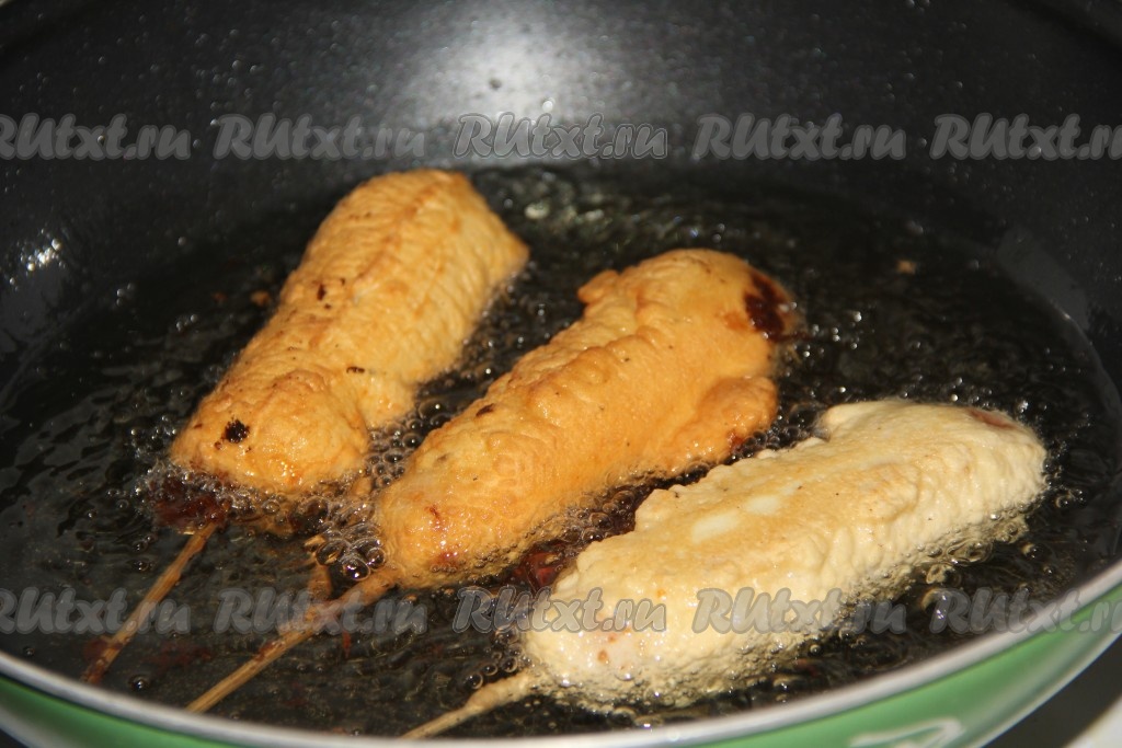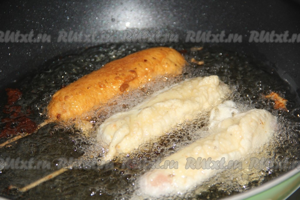 Растительное масло хорошо разогреть. Для жарки корн-догов я использовала глубокую сковороду. Выложить сосиски в тесте в разогретое масло (во фритюр).