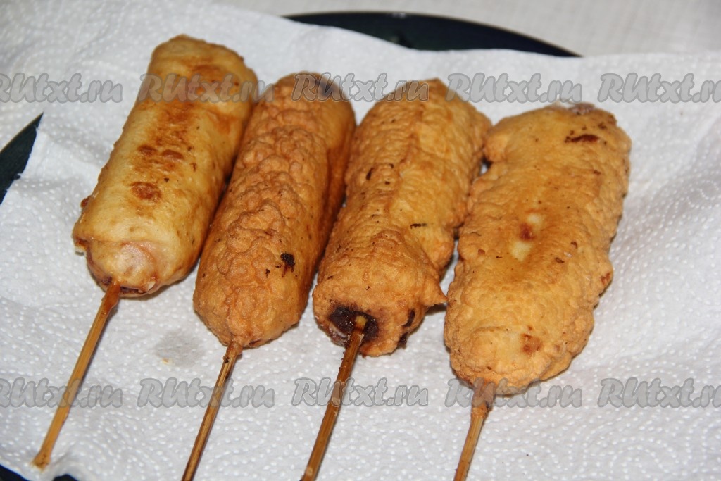 Готовые корн-доги выложить на бумажное полотенце или салфетку, чтобы удалить излишки растительного масла.