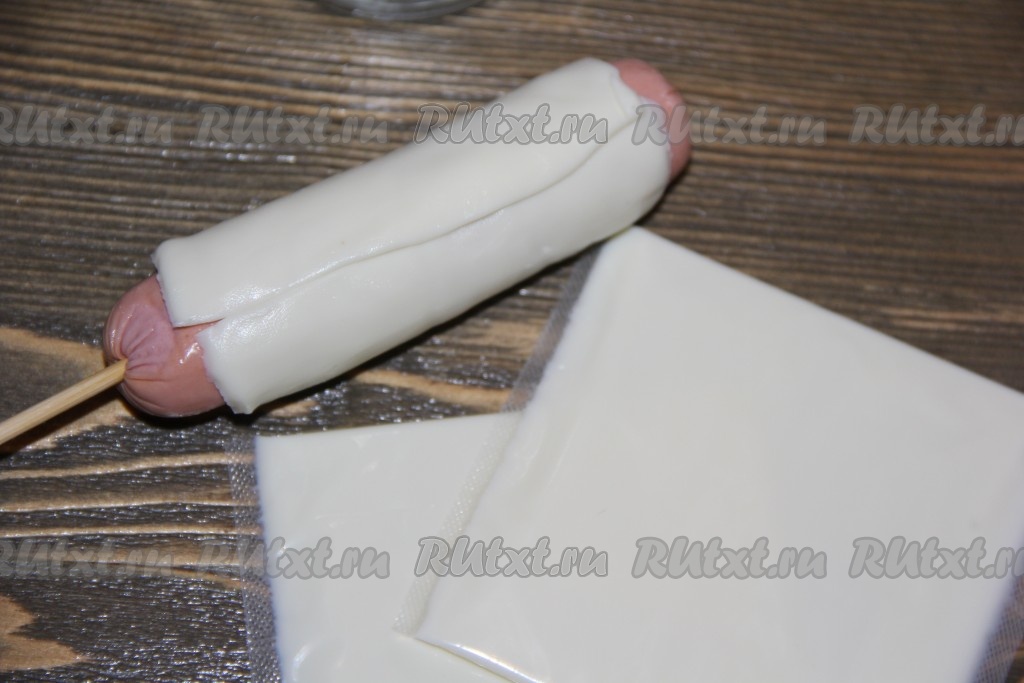 Обвернуть сосиску сыром и наколоть на палочку (как на фото).