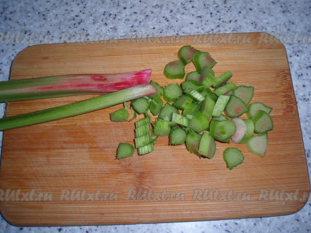 Черешки ревеня вымыть, очистить от прожилок, нарезать на кусочки.