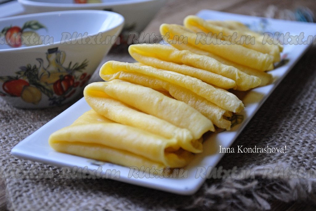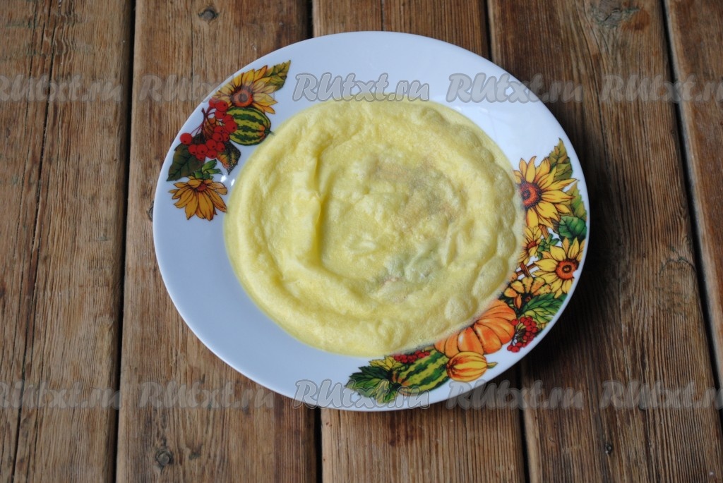 Выпекать блинчики в микроволновке 1 минуту при мощности 800 Ватт. Таким образом приготовить все блины, каждый раз смазывая тарелку растительным маслом.