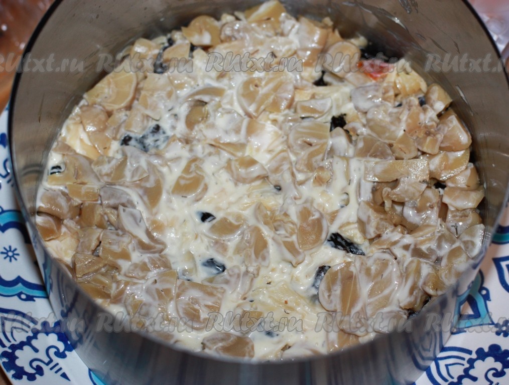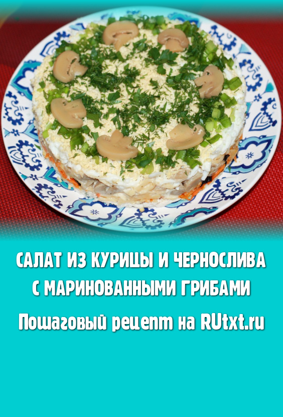 Салат из курицы и чернослива с маринованными грибами - аппетитное и яркое на вкус блюдо. Этот салат станет отличным вариантом закуски для праздничного стола.