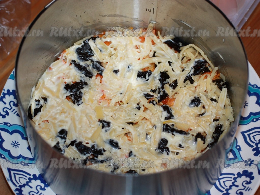 Чернослив промыть, залить на несколько минут горячей водой, дать постоять, затем воду слить и нарезать его соломкой. Выложить сверху на морковь.