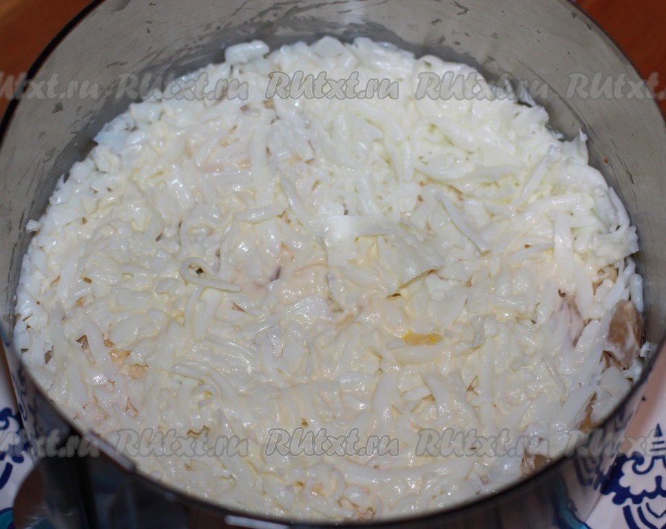 Грибы нарезать соломкой, выложить сверху на слой сыра, распределить, смазать майонезом.