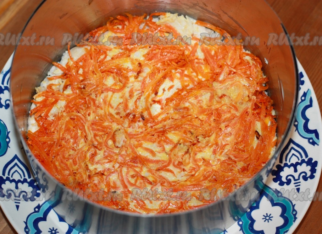 Морковь очистить, натереть на крупной терке, обжарить на сковороде на растительном масле до готовности, при этом посолить и поперчить по вкусу, выложить сверху на грудку и орехи. Чеснок мелко измельчить, половину от общего количества распределить по слою моркови, смазать майонезом.