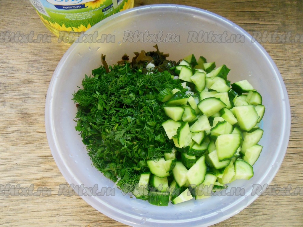 В миске соединить морскую капусту, зелень, зелёный лук и огурцы, влить растительное масло. Так как маринованная морская капуста уже солёная, соль я не добавляю, но вы можете посолить по вкусу.