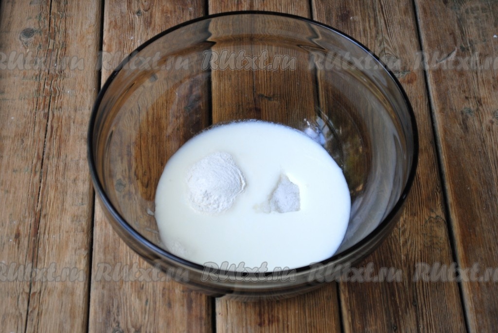 Кефир комнатной температуры вылить в миску, добавить соль и разрыхлитель.