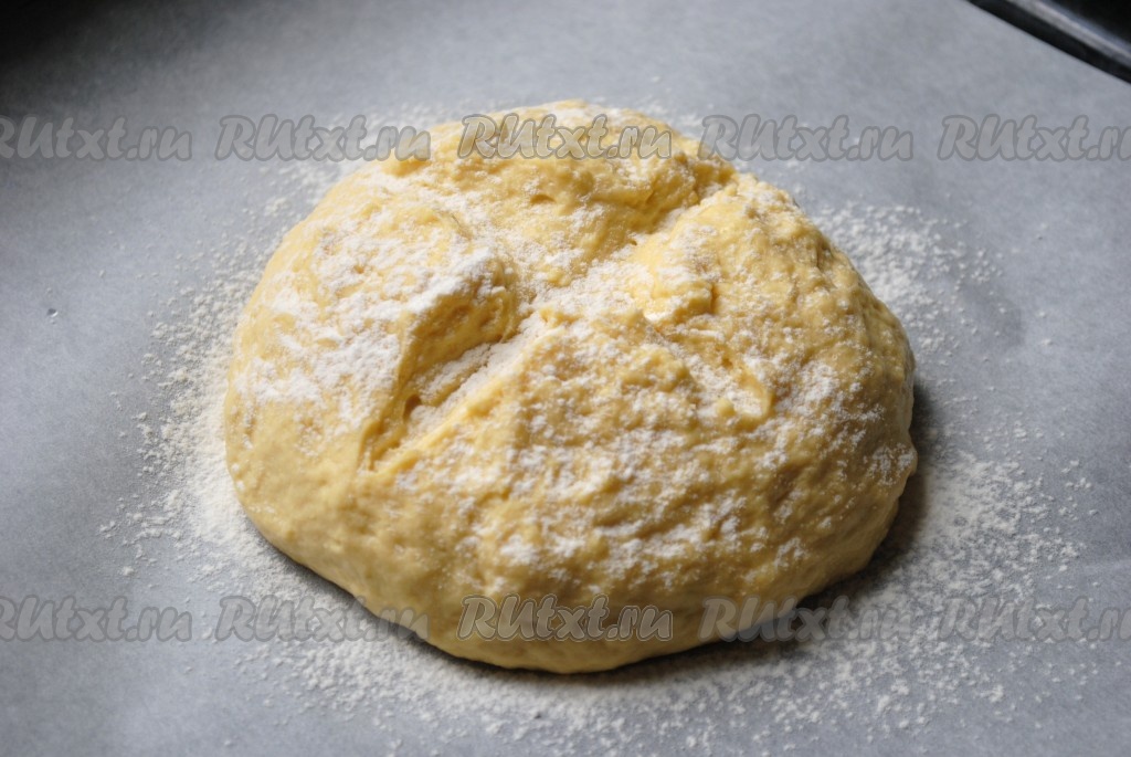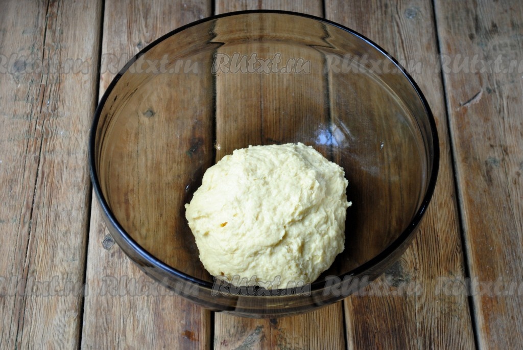 Замесить мягкое, немного липкое тесто. Чтобы было легче вымешивать, смажьте тесто и руки растительным маслом.