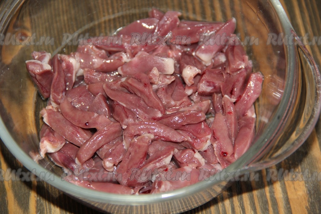 Для начала промыть сердечки под проточной водой, убрать сосуды и разрезать каждое сердечко на 4 части, убрав всю кровь.
