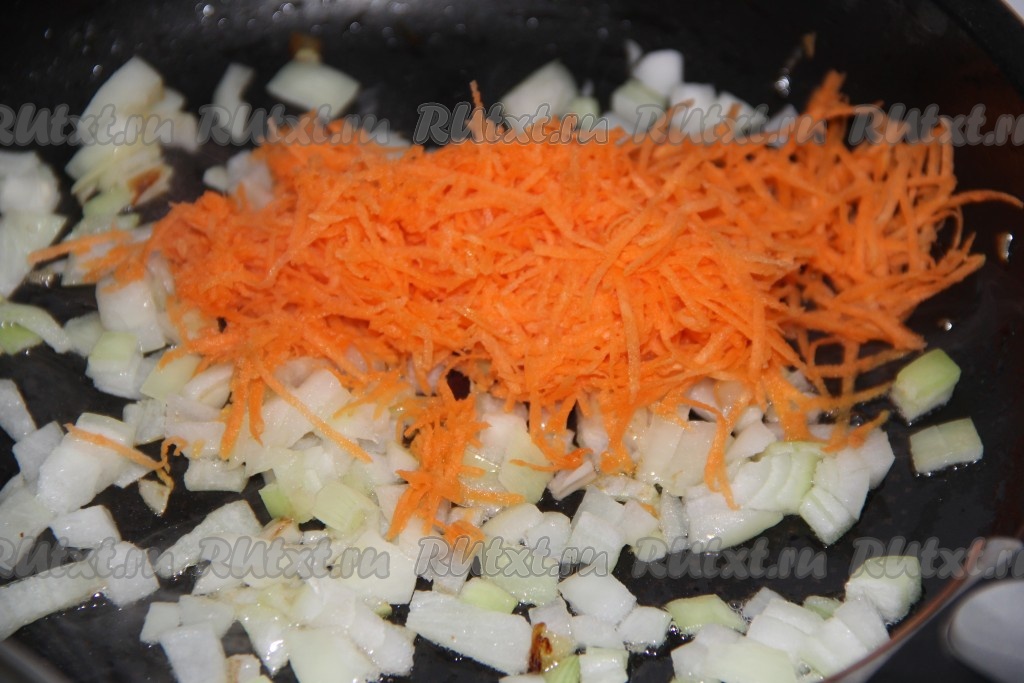 Очищенную морковь, натерев на крупной терке, выложить к луку, когда он станет золотистого цвета. Обжарить овощи на среднем огне, иногда помешивая, в течение 3-4 минут.