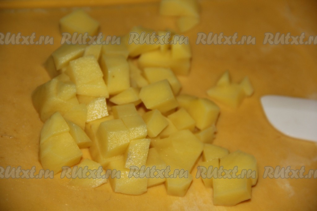 Картофель очистить и нарезать кубиками среднего размера.