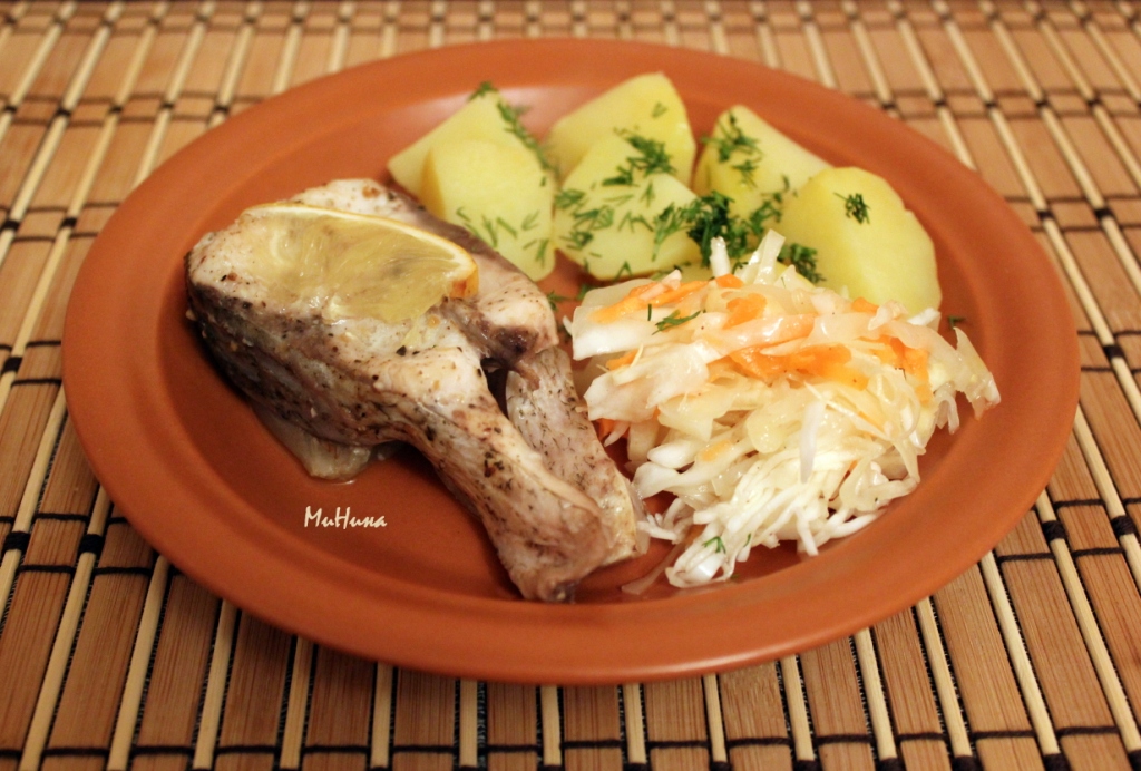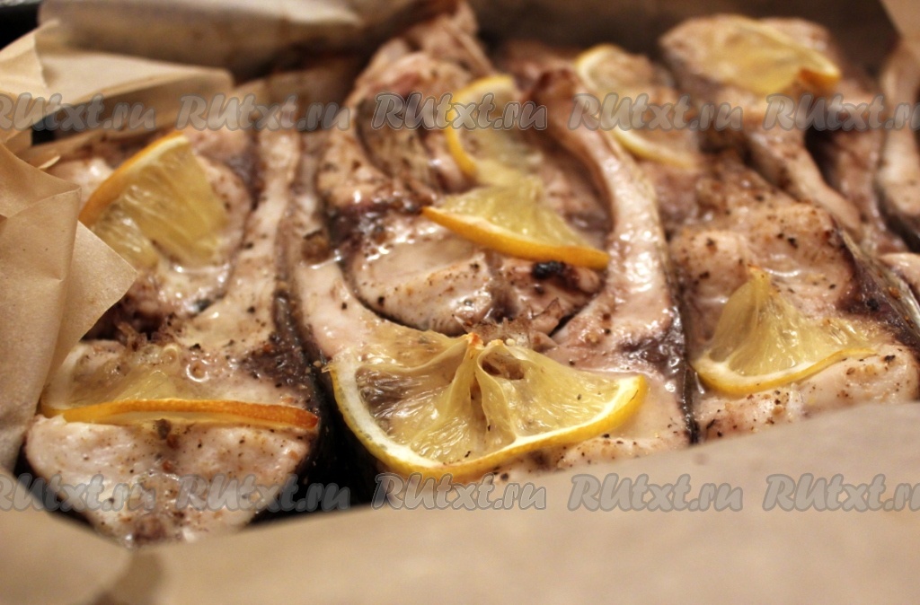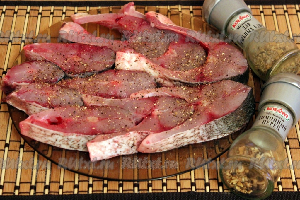 Лучше всего использовать охлаждённую свежую рыбу, но можно запечь и размороженную рыбку. Рыбу очистить от чешуи и внутренностей, отрезать плавники и голову, затем нарезать на кусочки толщиной, примерно, 1,5 см. Кусочки рыбки посолить, посыпать специями, перемешать, втирая специи в рыбу, оставить промариноваться минут на 10.