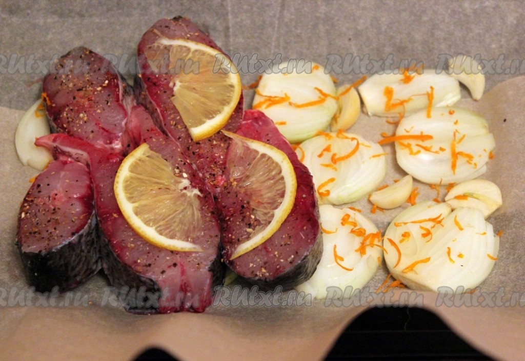 На противень положить пергамент (бумагу для запекания), смазывать её не надо, на бумагу первым слоем выложить кружочки лука, дольки чеснока и цедру лимона (или апельсина), вторым слоем положить кусочки толстолобика и сверху дольки лимона.