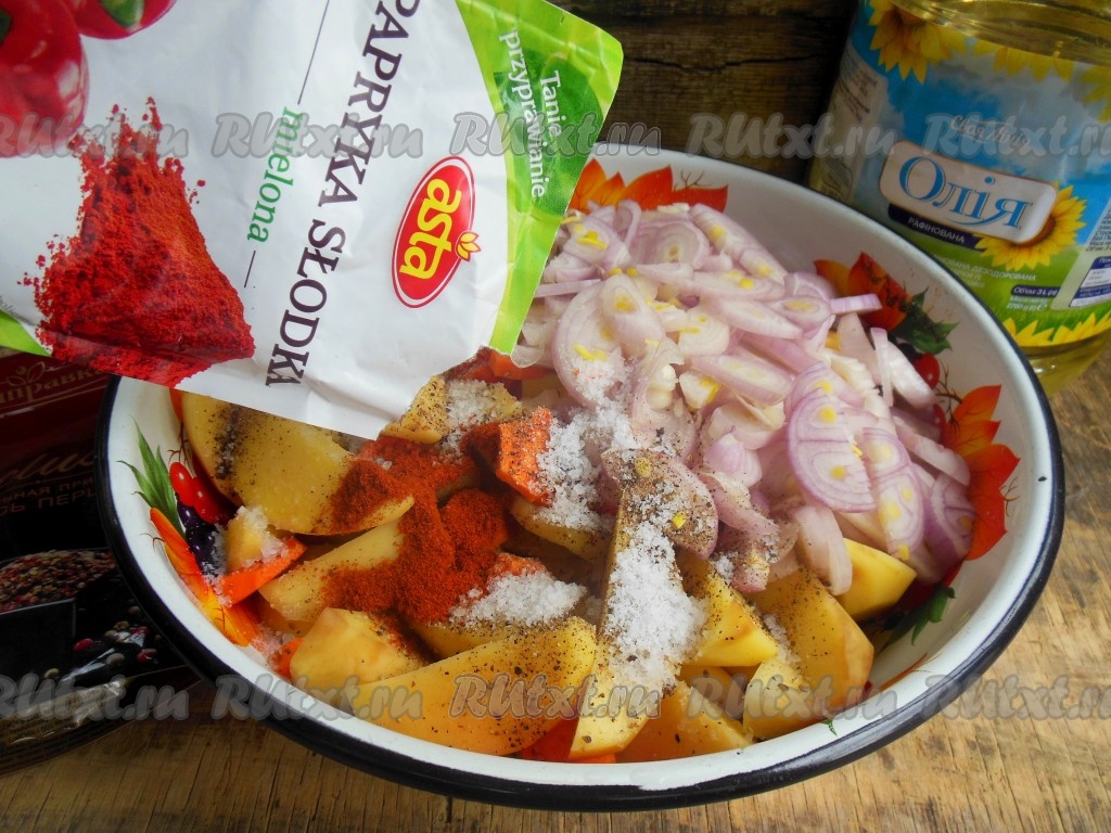 В глубокой миске смешайте картофель, морковь и лук, добавьте соль, смесь молотых перцев и паприку по вкусу, а также растительное масло.