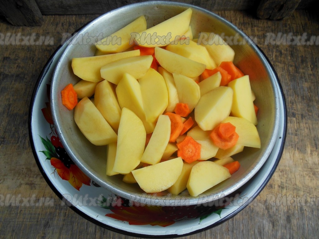 Каждую картофелину разрежьте на 4 части. Морковь нарежьте колечками.