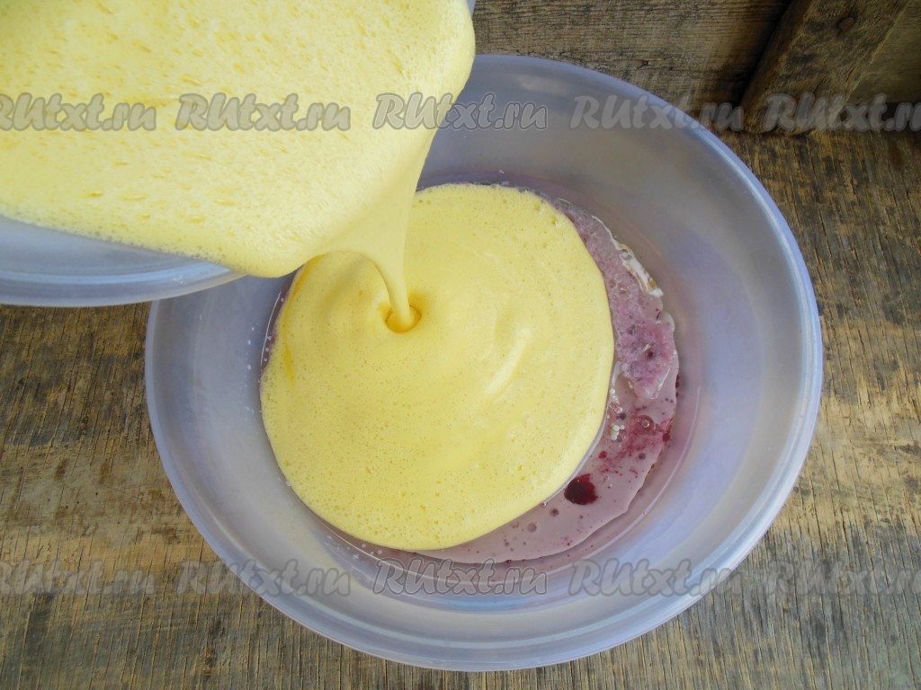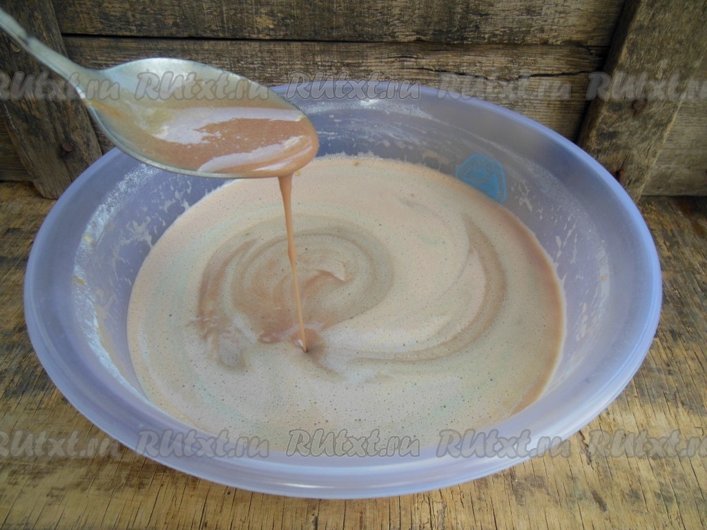 Еще раз взбейте массу при помощи миксера до однородности. Погасите соду уксусом (или лимонным соком), добавьте в тесто и перемешайте. По консистенции тесто напоминает блинное, легко стекает с ложки. Будет казаться, что мало муки, но больше не добавляйте!