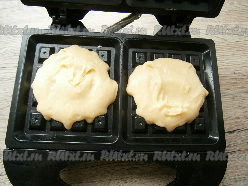 Электровафельницу разогреть, выложить 2 столовые ложки теста, крышку закрыть.