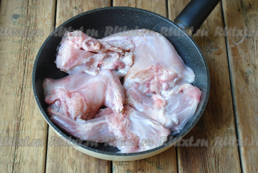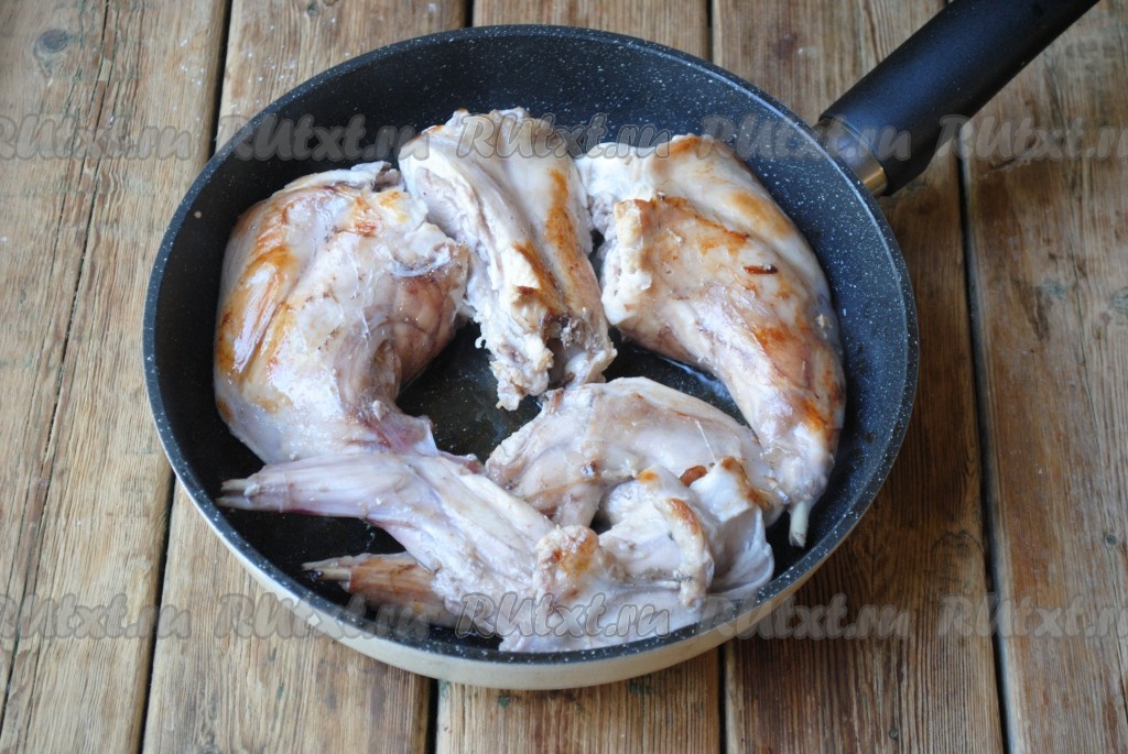 Мясо кролика вымыть, обсушить и нарезать на порционные кусочки. Сковороду хорошо разогреть с растительным маслом и выложить кусочки кролика.