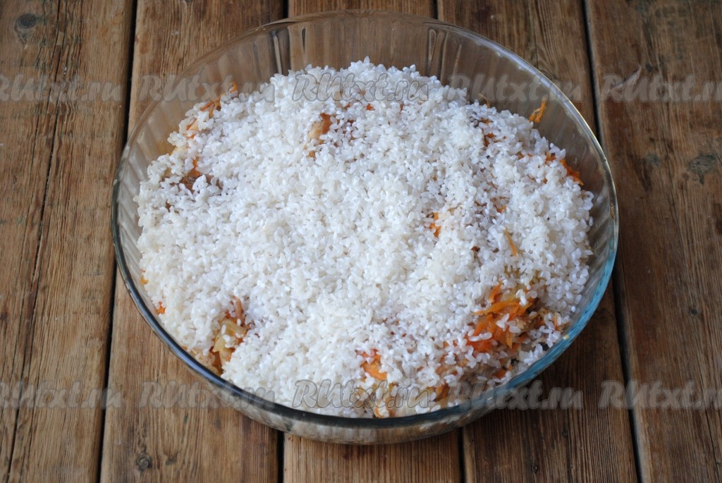 Сверху выложить промытый рис и разровнять. Добавить ещё соли.