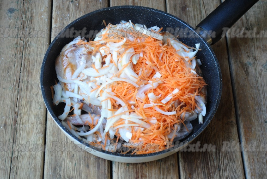 Выложить морковку с луком к обжаренным кусочкам кролика и готовить на среднем огне, периодически помешивая, в течение 3-4 минут (до мягкости овощей).