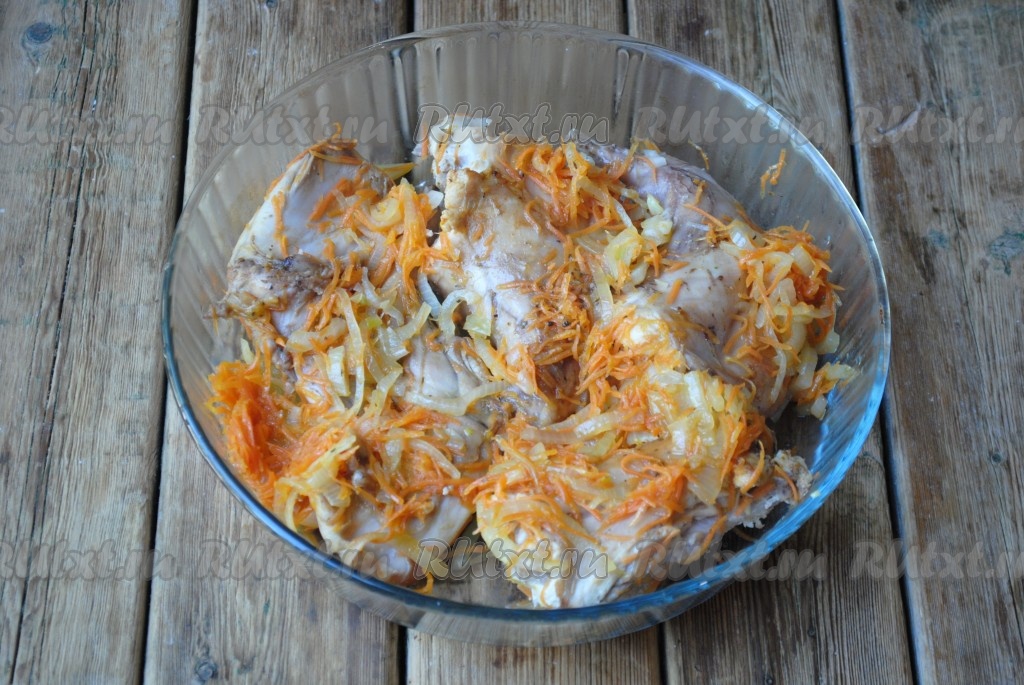 Мясо с луком и морковкой выложить в форму для запекания.