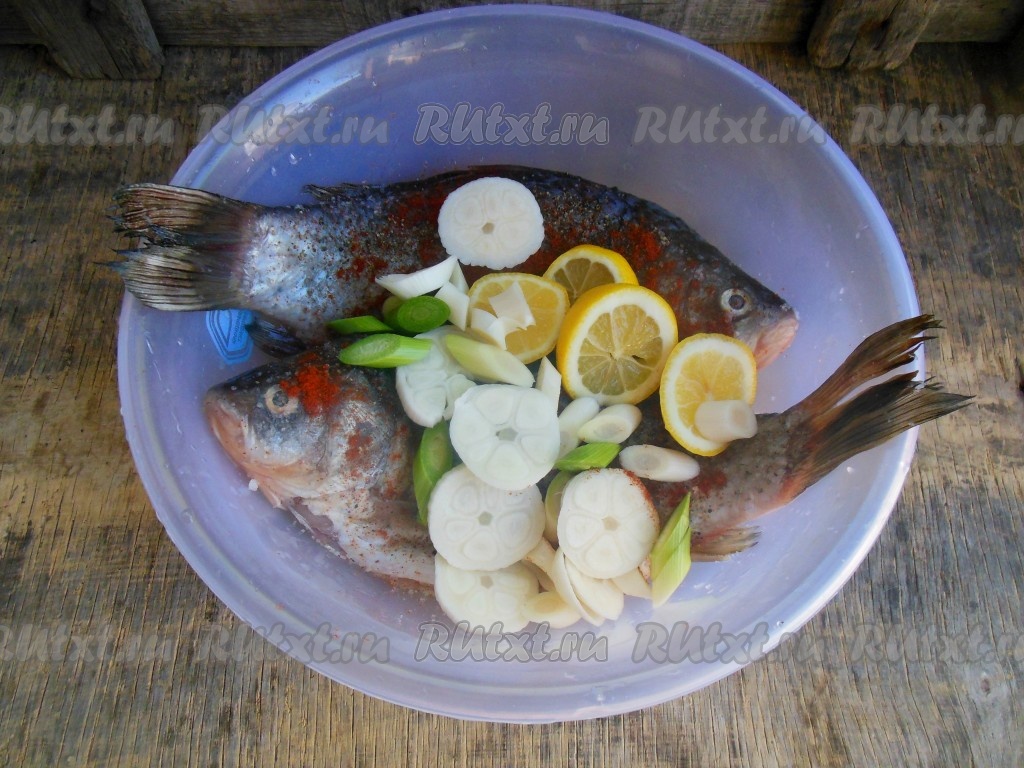 Карасей очистите от чешуи, удалите жабры и внутренности. Тщательно промойте рыбу под проточной водой. В глубокую миску поместите карасей, добавьте соль, смесь молотых перцев и паприку, выжатый из лимона сок, кружочки лимона, из которых выдавливали сок, очищенные и нарезанные кружочками головки чеснока, перемешайте, не забывая натереть рыбку и внутри.