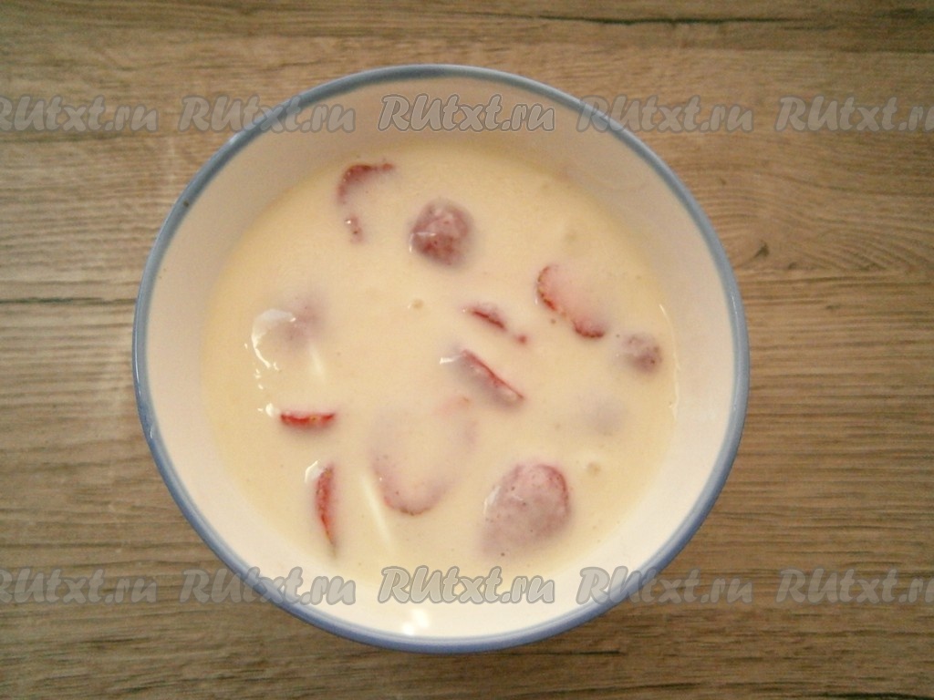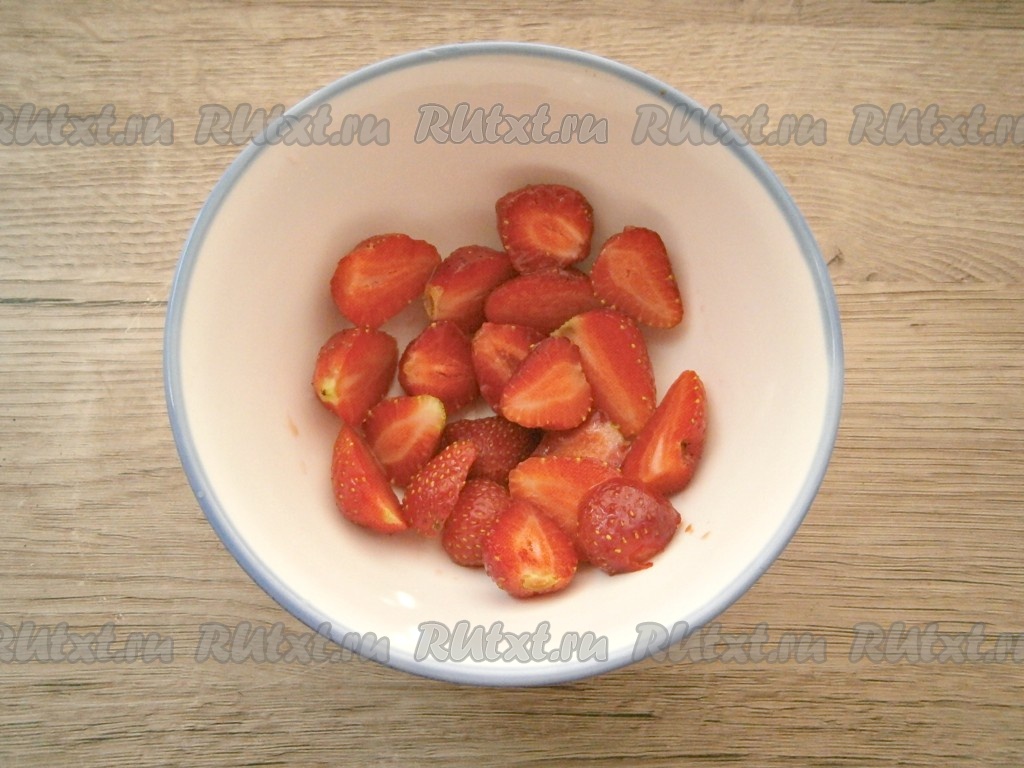 В небольшую формочку или пиалу выложить нарезанную на 2-4 части свежую клубнику.