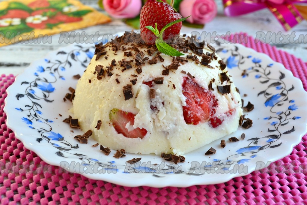 Отправить десерт в холодильник на 2 часа, после чего дно и бока формы опустить на 1-2 минуты в горячую воду и острым ножом провести по внутренним стенкам формы (чтобы легче было отделить десерт от формы). Замечательное, очень вкусное сметанное желе с клубникой перевернуть на тарелку, посыпать тертым шоколадом и украсить мятой при подаче.