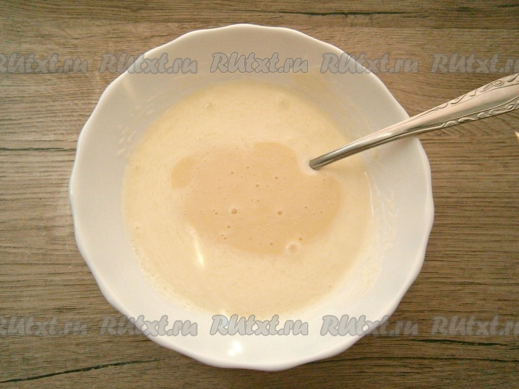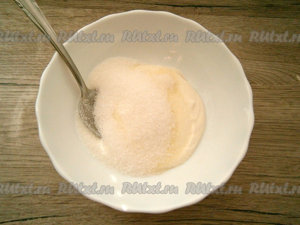 К сметане добавить сахар и ванильный сахар, хорошенько перемешать. Оставить сметану на 10 минут, чтобы сахар по максимуму растворился.