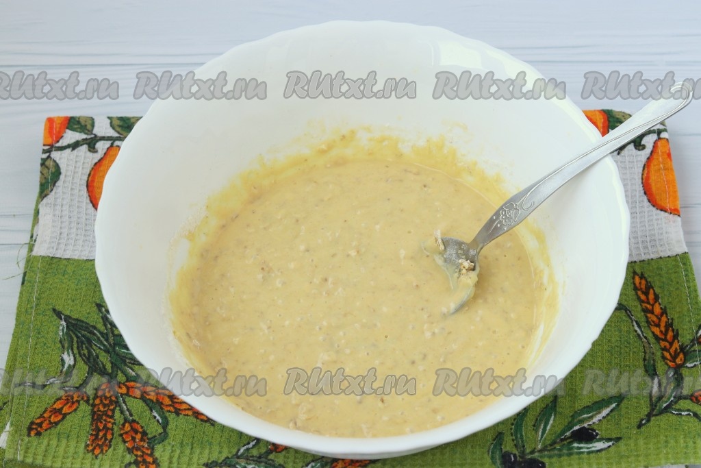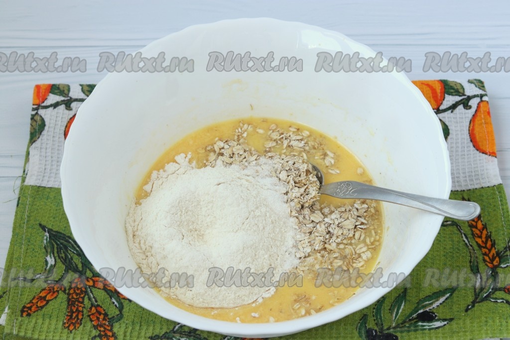 В смесь кефира, яйца и масла добавить соду, перемешать, всыпать муку и овсяные хлопья, перемешать тесто.