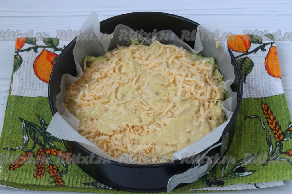 Форму диаметром 22 см застелить пергаментом, вылить половину теста, затем выложить капусту, посыпать натертым сыром и вылить оставшееся тесто.
