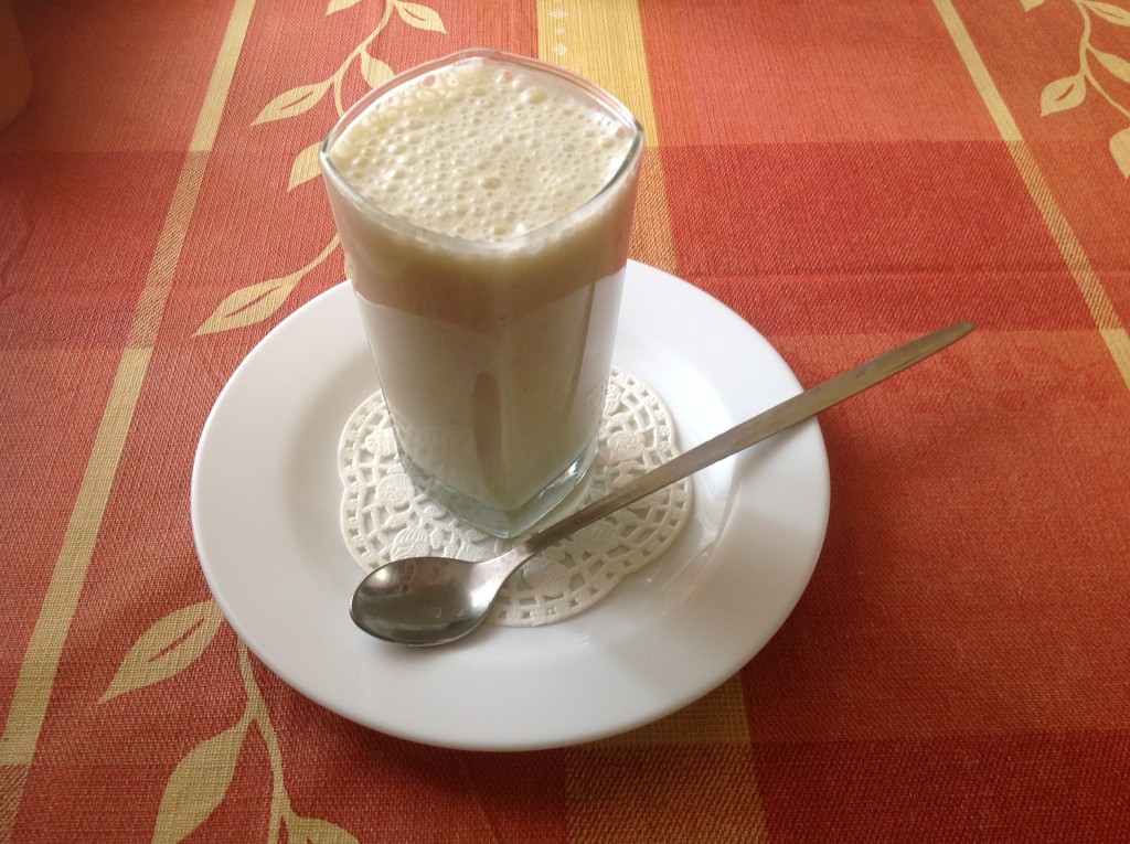Готовый банановый коктейль наливаем в высокий стакан и сразу же подаём.