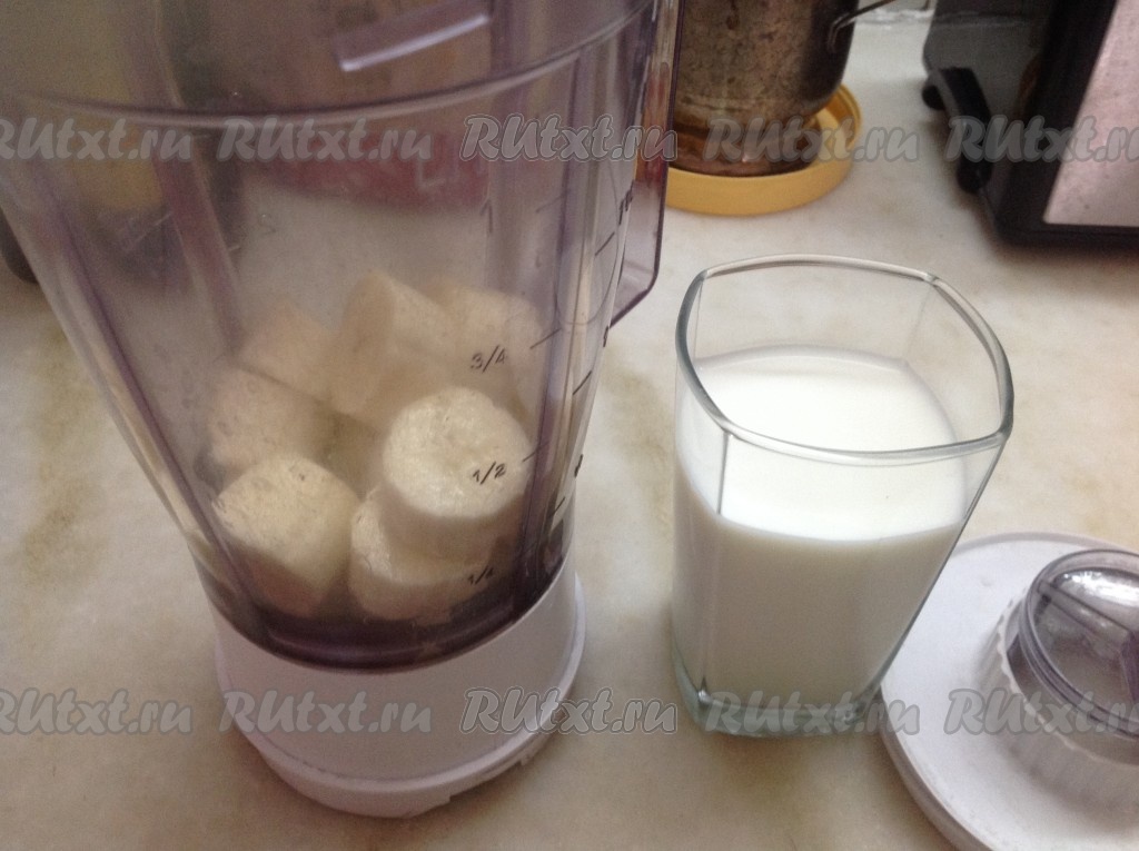 Моем и очищаем бананы, нарезаем и отправляем в блендер. Заливаем кусочки бананов стаканом охлаждённого молока.