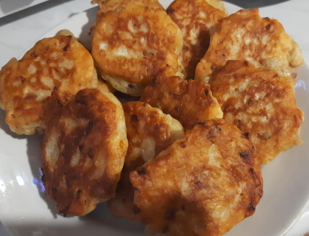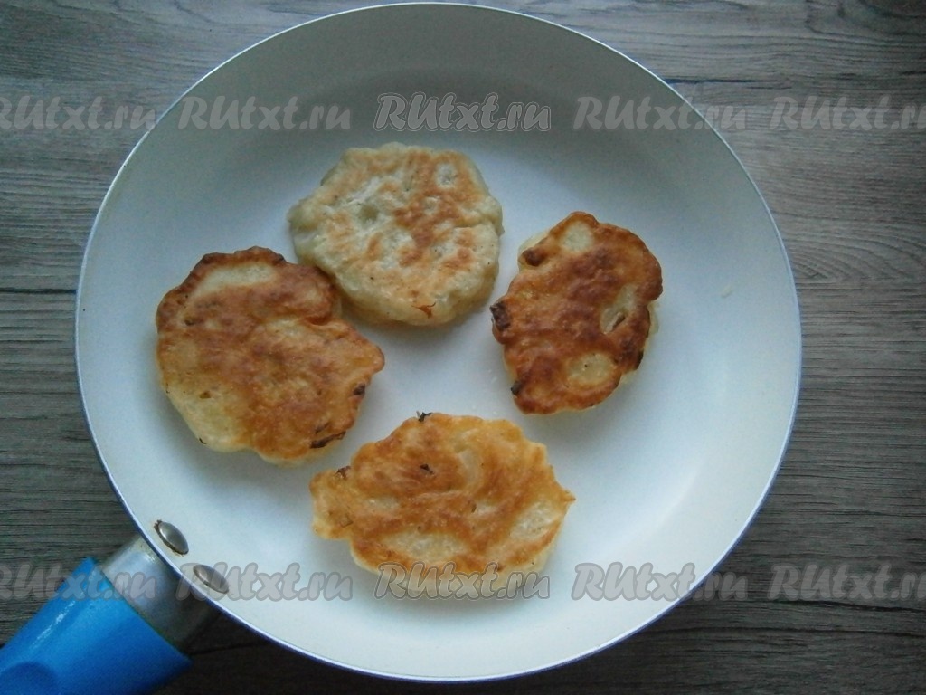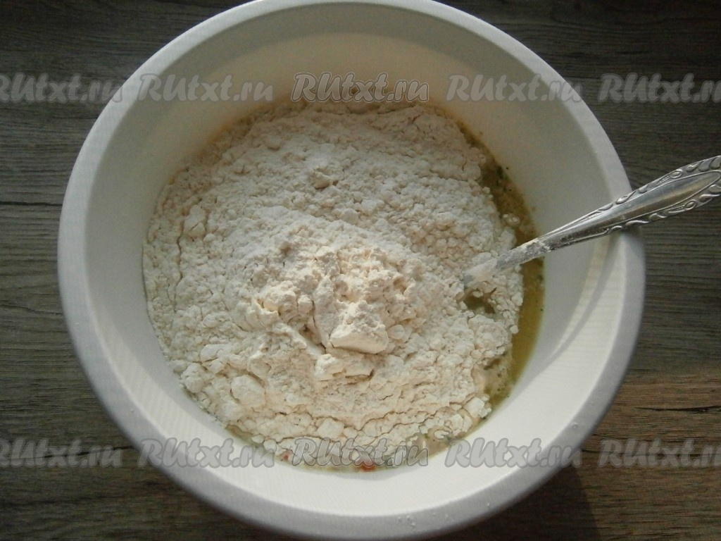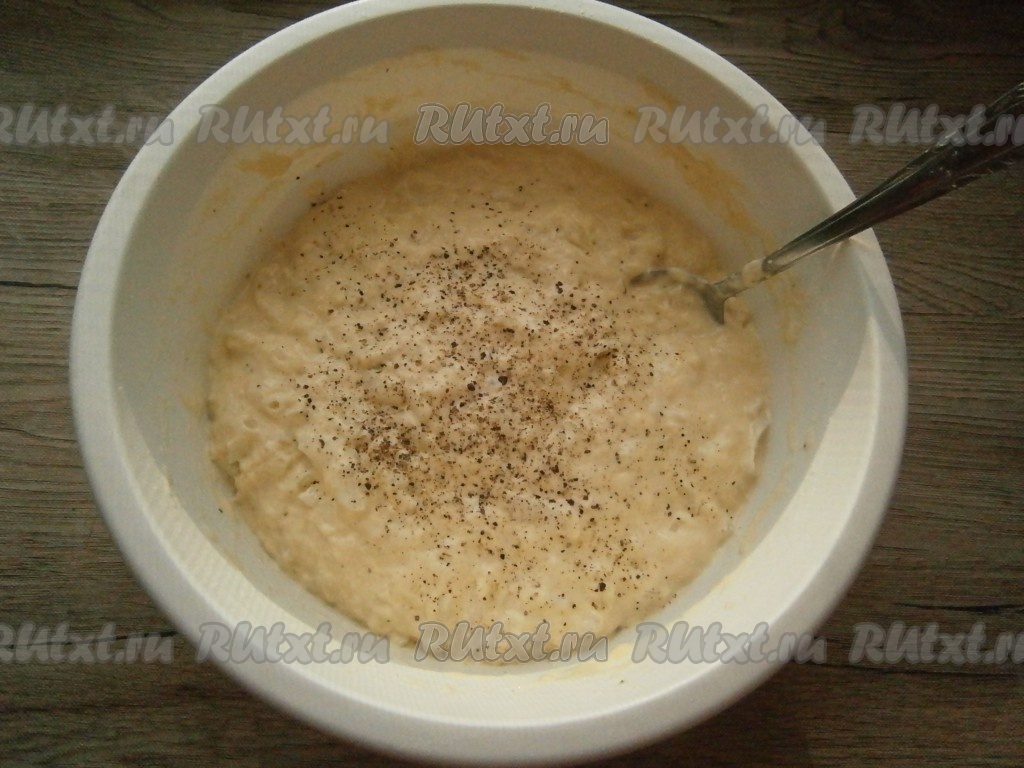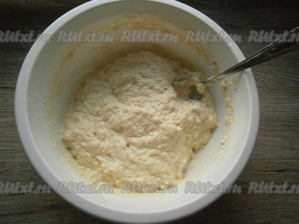Перемешать, замешивая ложкой довольно густое тесто (чуть гуще, чем для обычных оладий). Соль добавлять в тесто не нужно, так как приправа соленая.