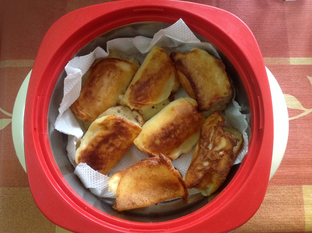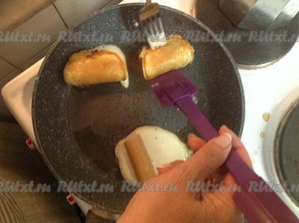 Проделать тоже самое со всеми кружочками. Обжарить конвертики-оладушки на среднем огне до румяности, переворачивая по мере необходимости.