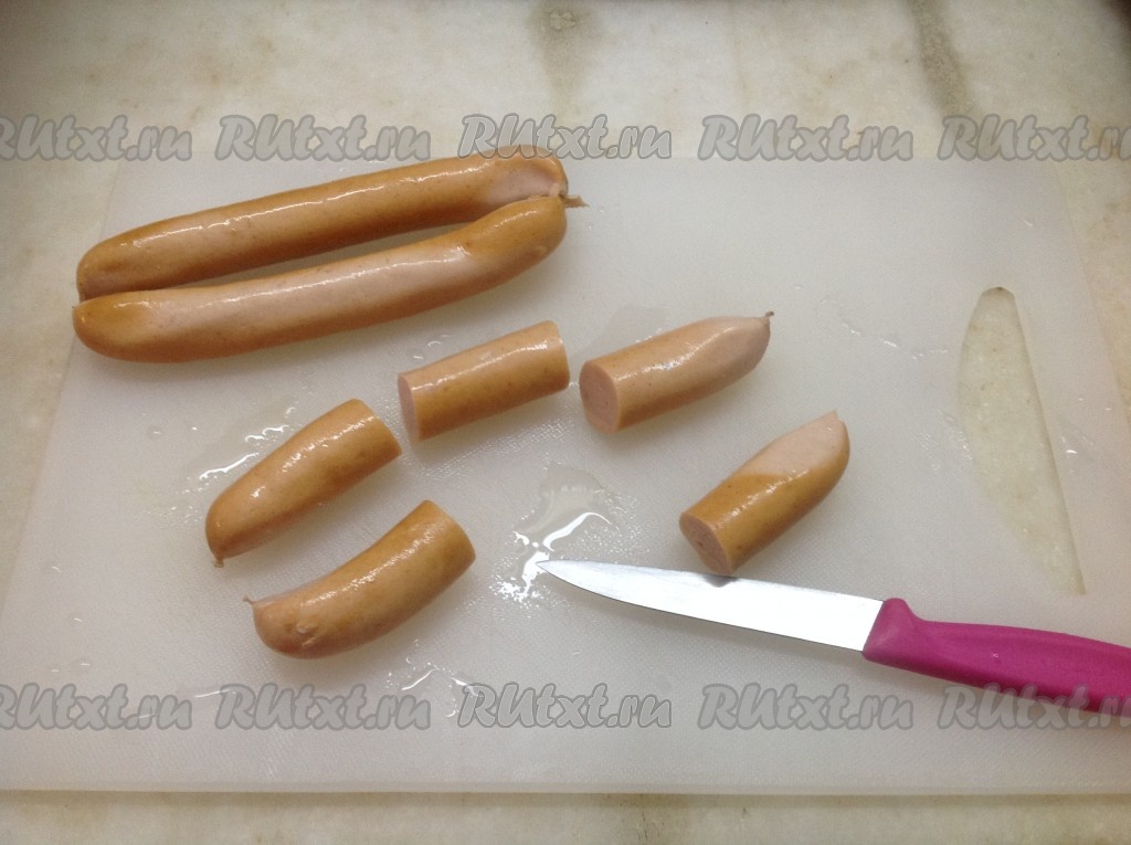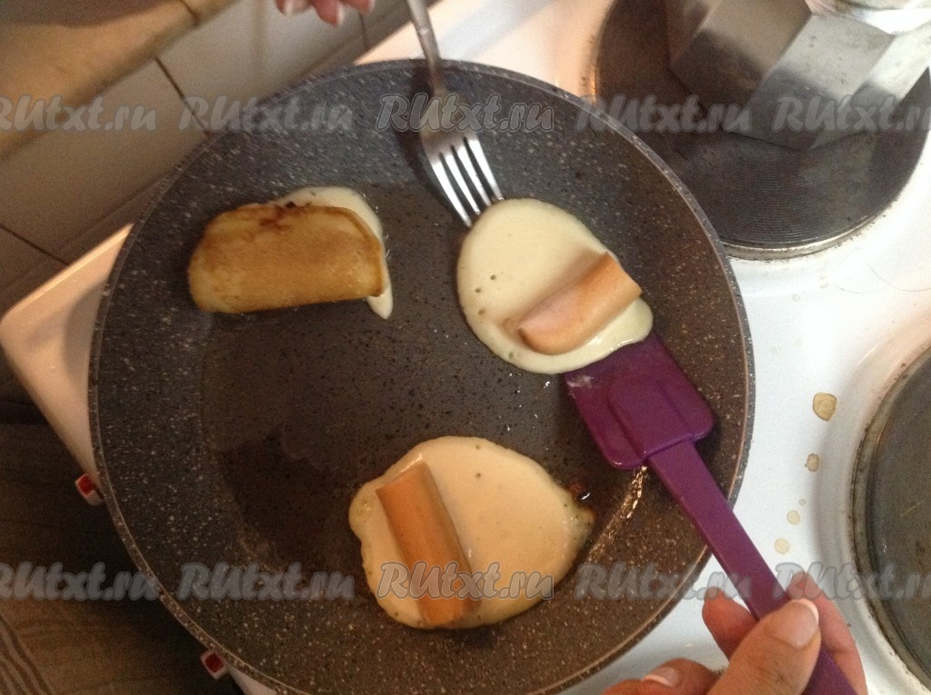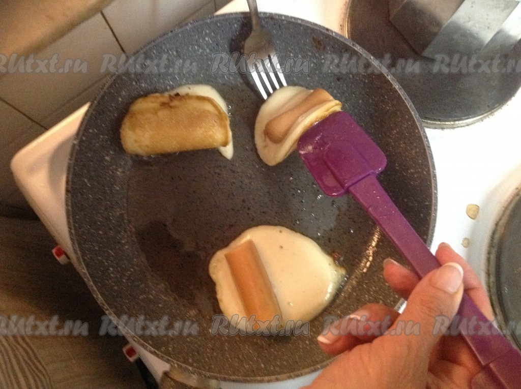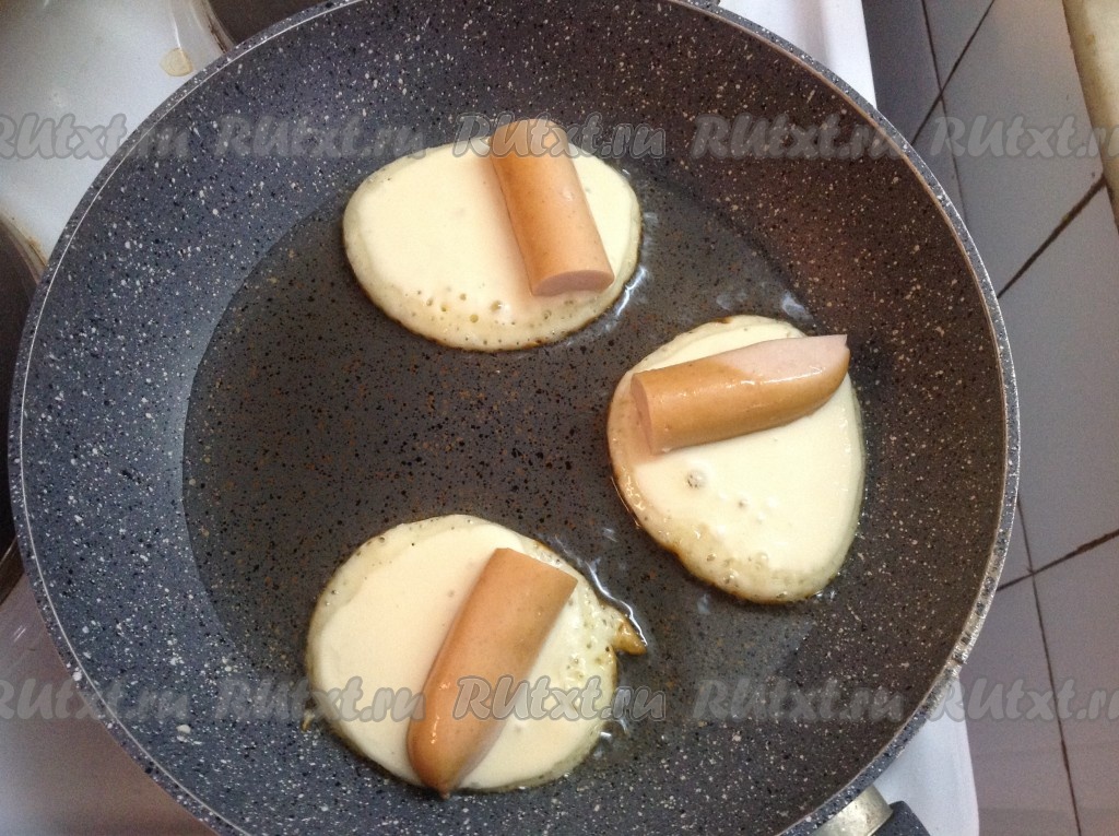 На каждый кружок теста положить кусочек сосиски немного ближе к одному краю. Тем временем оладушки начнут поджариваться с одной стороны.