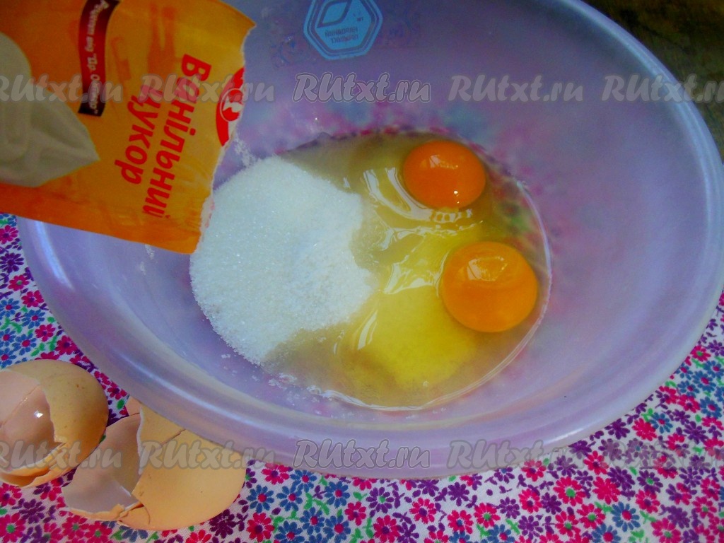 Пока активируются дрожжи, отдельно в миске соедините оставшийся сахар, соль и ванильный сахар, добавьте яйца.