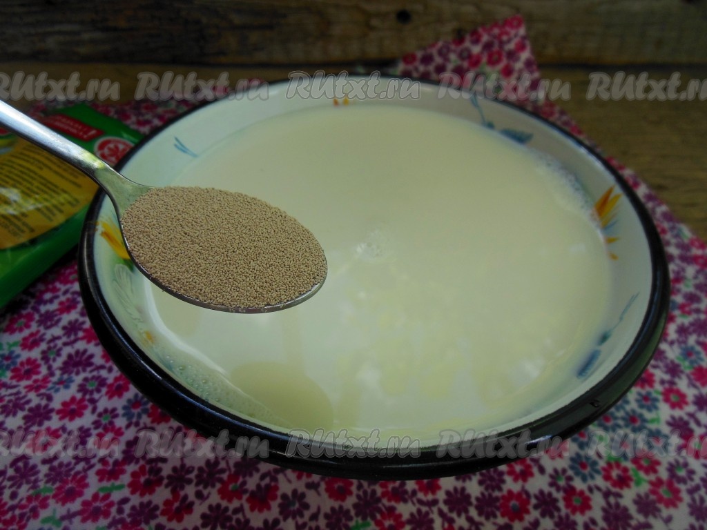 В теплое молоко добавьте щепотку сахара и сухие дрожжи, перемешайте получившуюся опару столовой ложкой и накройте полотенцем.