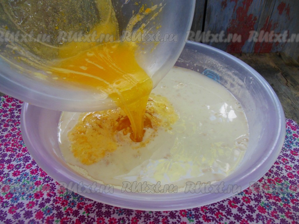 Затем влейте сахарно-яичную массу, перемешайте ложкой до полной однородности.