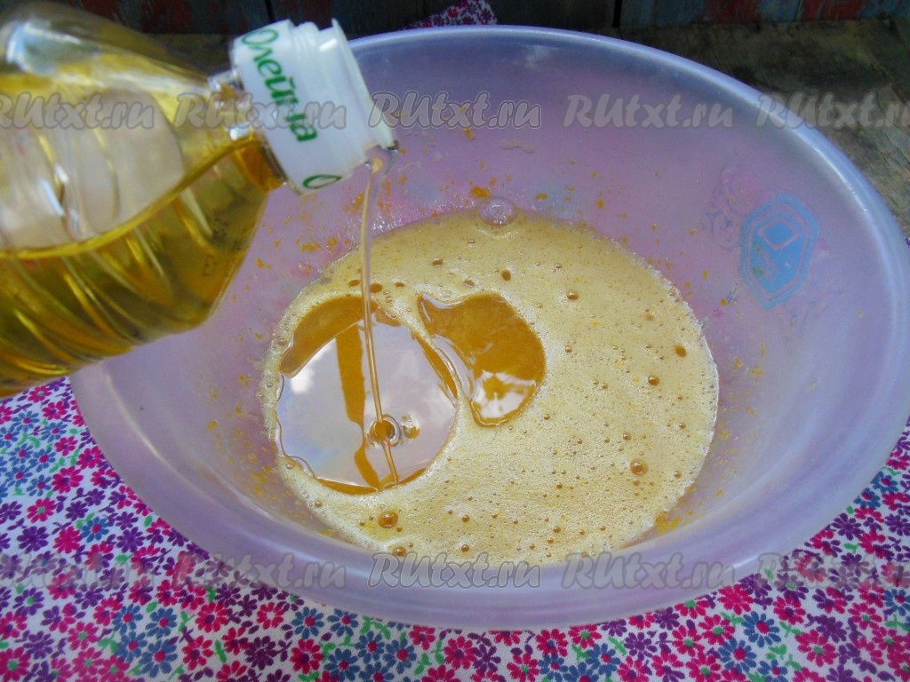 Взбейте сахарно-яичную массу вилкой, добавьте растительное масло, перемешайте.